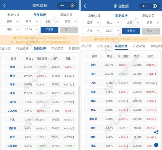 2025年1-4月,空調市場市佔率線下及線上渠道前十名 / 奧維雲網截圖