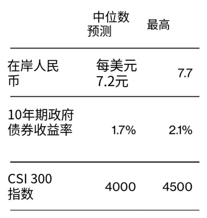 在匯率方面,17位受訪者的預測中值顯示,到2025年底,人民幣匯率預計將穩定在7.2兑1美元附近。當前市場對人民幣貶值的預期有所降温,因外界普遍認為監管機構將控制資本流動,避免劇烈的外匯波動。