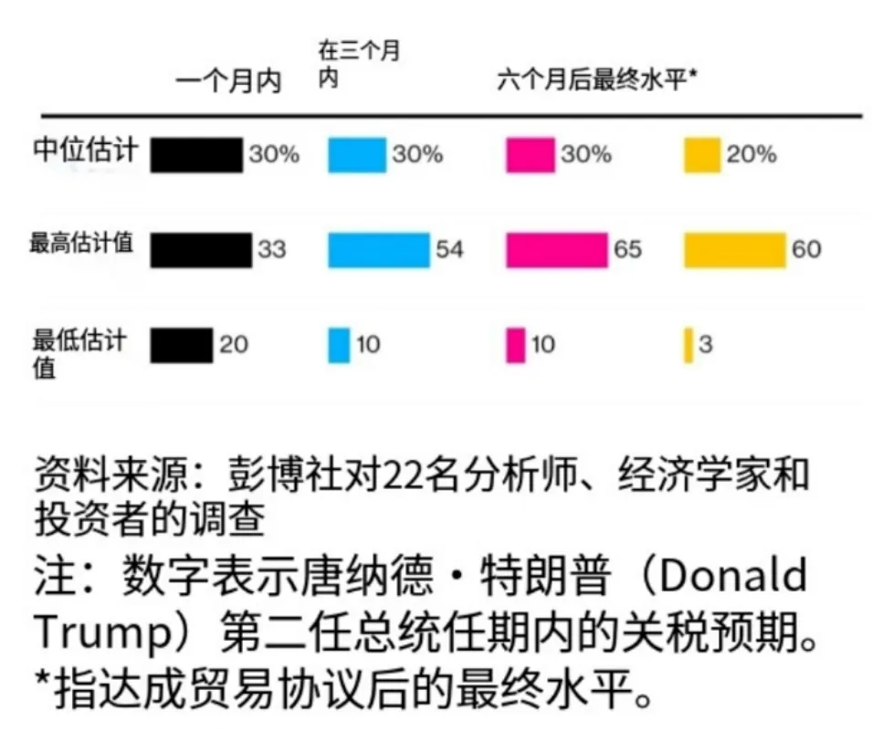 此次調查還反映出,對未來關税走向的看法出現分歧:有7位受訪者認為關税將在未來6個月內低於30%,另有6人則預測將進一步上調。若中美最終達成全面貿易協議,調查中值預測關税可能降至20%左右。而特朗普第一任期內所實施的平均12%關税,則被多數分析師認為將繼續保留,因若貿然取消,恐引發其核心支持者不滿。