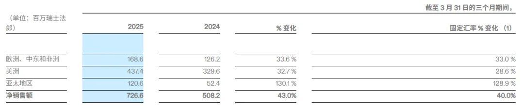 分地區來看,期內歐洲、中東和非洲(EMEA)地區淨銷售額增長33.6%至1.69億瑞士法郎,美洲地區增長32.7%至4.38億瑞士法郎,亞太地區增長130.1%至1.21億瑞士法郎。