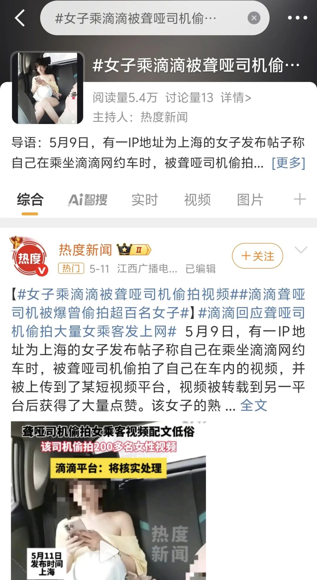 5月9日,有一IP地址為上海的女子發佈帖子稱自己在乘坐滴滴網約車時,被一名司機偷拍了自己在車內的視頻,並被上傳到了某短視頻平台,視頻被轉載到另一平台後獲得了大量點贊。該女子的熟人發現後將該情況告知女子,女子這才知道自己在車內被錄像。