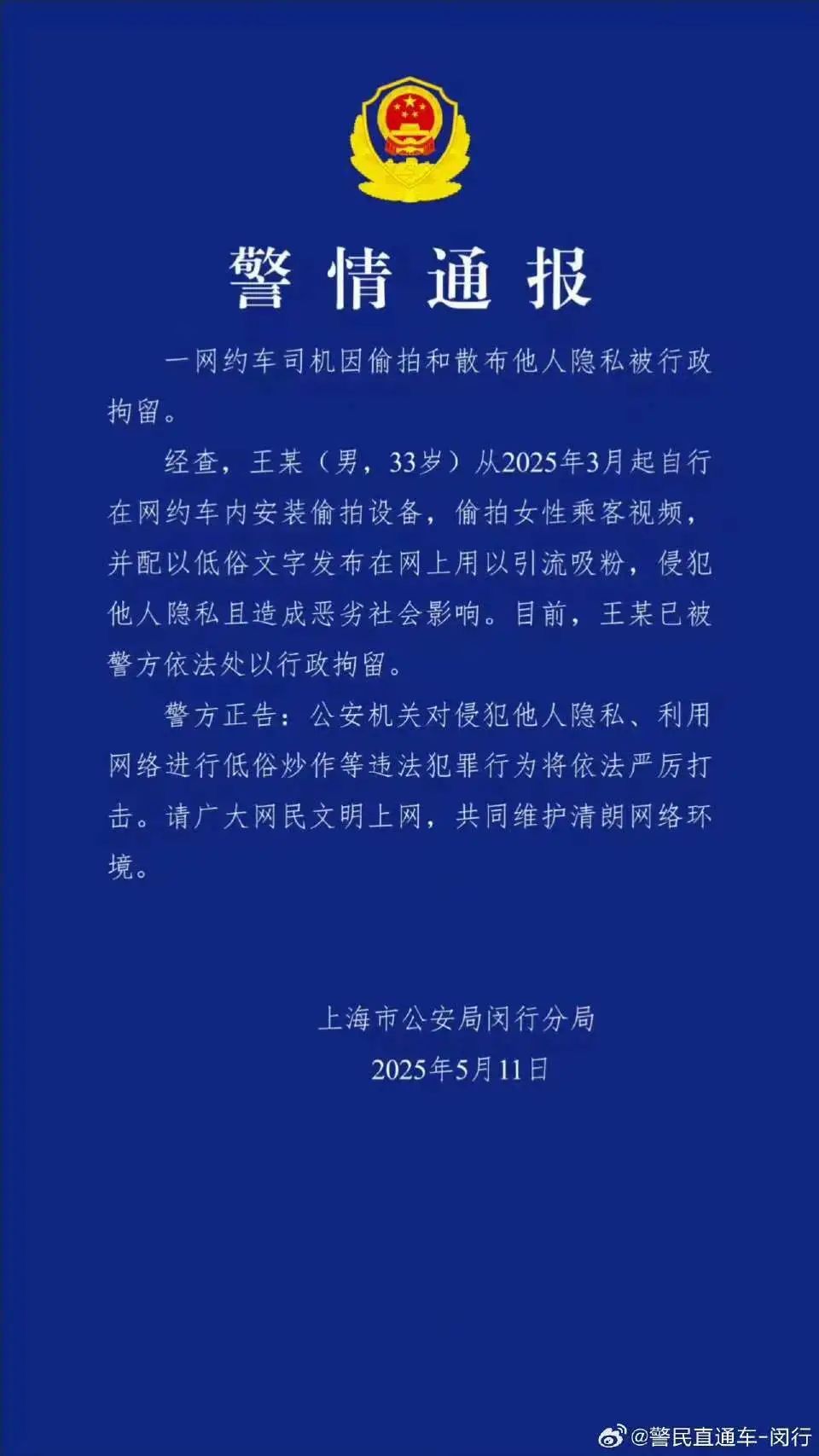 5月11日,上海市公安局閔行分局發佈警情通報:經查,王某(男,33歲)從2025年3月起自行在網約車內安裝偷拍設備,偷拍女性乘客視頻,並配以低俗文字發佈在網上用以引流吸粉,侵犯他人隱私且造成惡劣社會影響。目前,王某已被警方依法處以行政拘留。