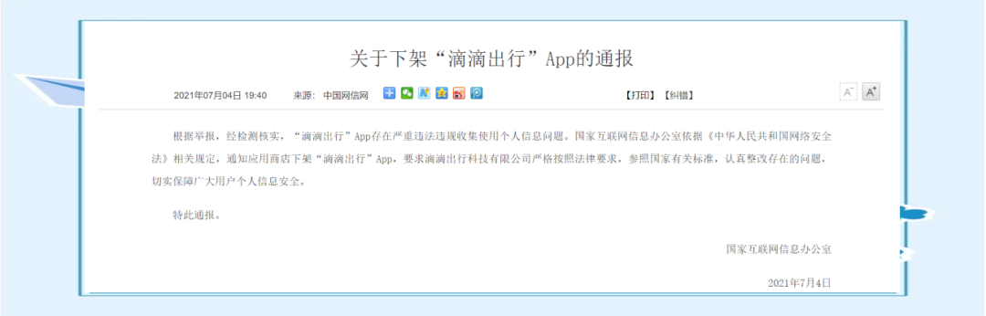 7月4日,國家網信辦發佈消息,經檢測核實,“滴滴出行”App存在嚴重違法違規收集使用個人信息問題。國家互聯網信息辦公室依據《中華人民共和國網絡安全法》相關規定,通知應用商店下架“滴滴出行”App,關於下架“滴滴出行”App 的通報。