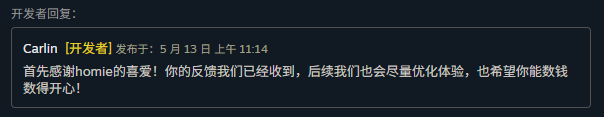 遊戲上線後在Steam上獲得了87%的“特別好評”。有趣的是差評則多集中在“數錢太累”上:在後期出現的標記鈔無法被點鈔機自動過濾,玩家只能一張張手動篩選,考慮到海量的鈔票數量,的確讓人有些招架不來。製作組也作出回應,會在近期放出更新,優化大家的數錢體驗。
