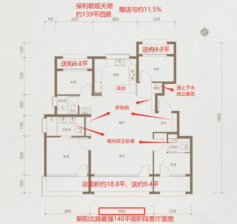 第一,得房率高。宣傳中139㎡户型得房率99%,實際可能還要更高一些。朝觀天珺這次把樣板間的窗子向外凸出了20釐米,放大了空間感,不知道最後其他户型敢不敢這樣做,這個卷法還挺有“勇氣”的。