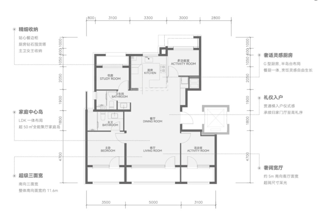 第二,户型相對實用。南向三面寬,同時都做了落地窗,兼顧視野和採光,此外客餐廳島台,雙主卧套房等,現在“好房子”都在卷的設計,基本都有。