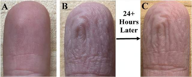 (A)常態手指;(B)浸水30分鐘後的手指;(C)間隔1天后再次浸水的手指 | Rachel Laytin, Guy K. German
