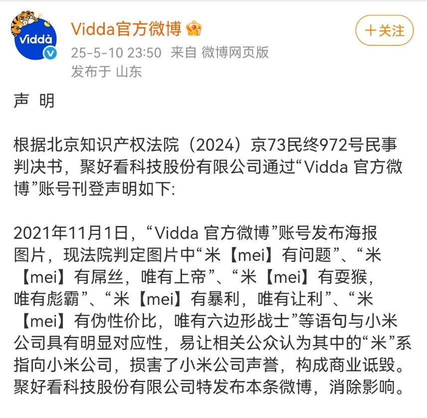 法院判決聚好看公司在“Vidda 官方微博”賬號置頂位置,連續七日刊登聲明消除對小米的影響,並且處以罰款50萬元。
