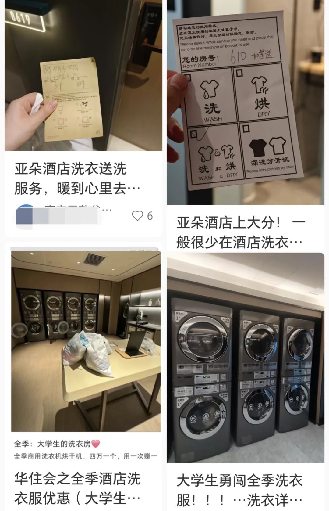 最出圈的是這兩家酒店的免費自助洗衣服務,去年網上掀起一股“開房熱”,就是為了“蹭”免費洗衣服務。小紅書上不少自來水,把他們稱為“大學生的洗衣房”。