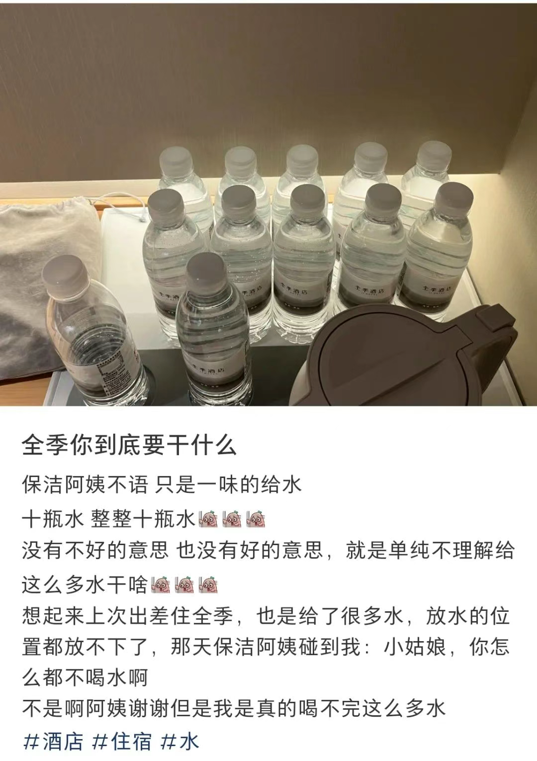 全季還會在房間裏放足足8瓶礦泉水,讓你從進店到離店都不缺水喝。