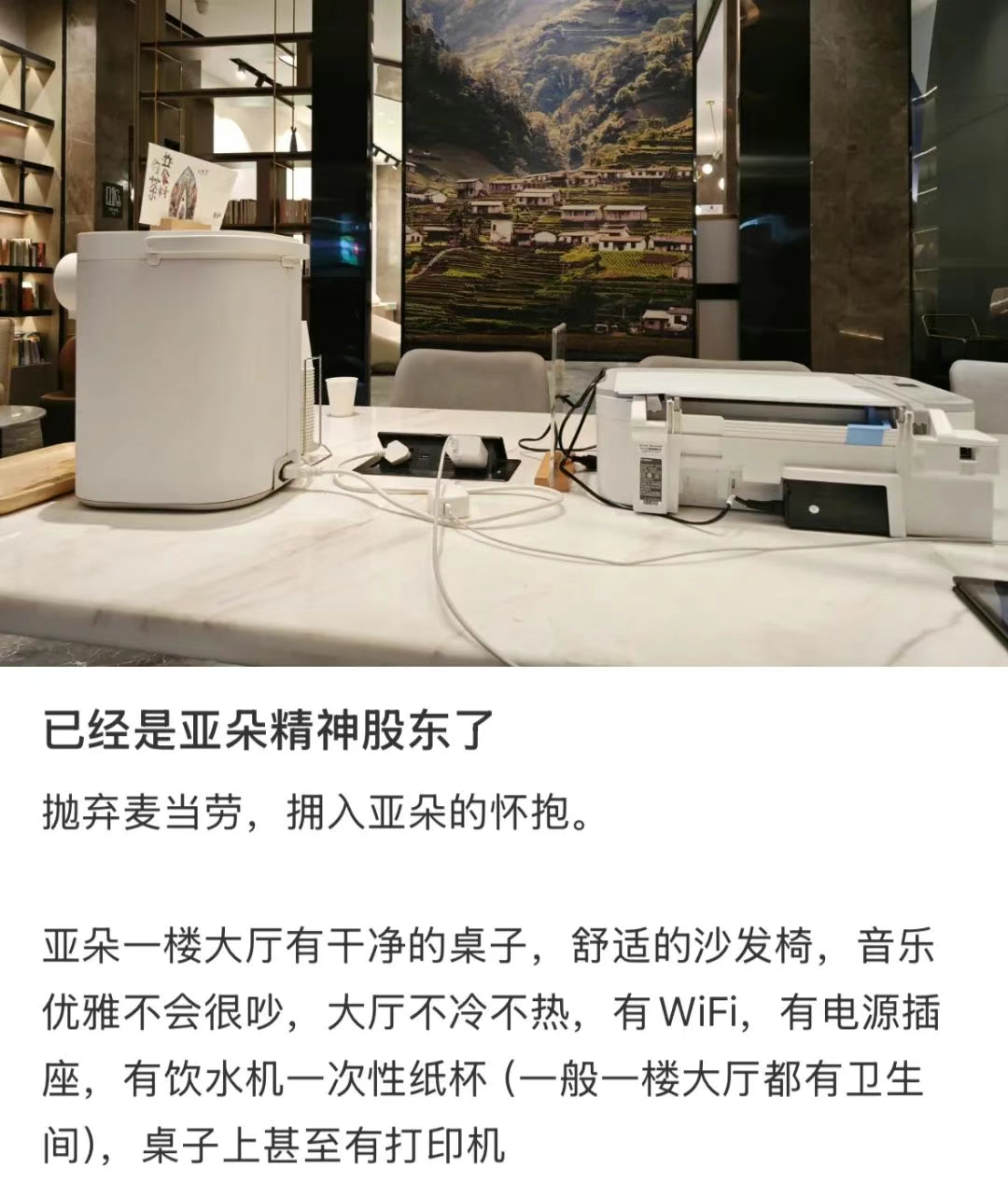亞朵酒店的大堂卡座、圖書角和餐廳裏,無論何時都擠滿了抱着電腦的牛馬,為了方便大家辦公,亞朵大堂的桌上,甚至會安裝打印機。
