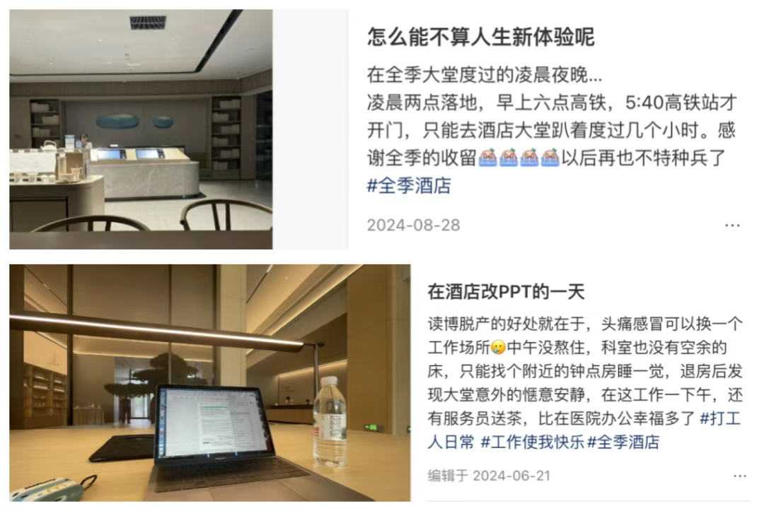 但近兩年提起亞朵和全季,他們的標籤都有了明顯變化,都變成了“出差打工人的避風港”,班味濃度也成亞朵和全季PK五星級酒店的神秘力量之一。