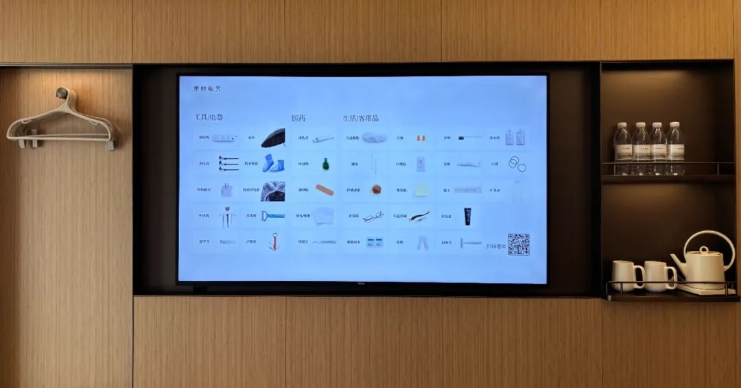 在全季的免費應急包裏,不僅充電器、充電線免費,還有兒童牙刷、老花鏡、姨媽巾和紅糖,且這個清單還貼心地投屏到電視桌面上,這裏面任何一個東西被用到,都可能收穫一個死忠粉。