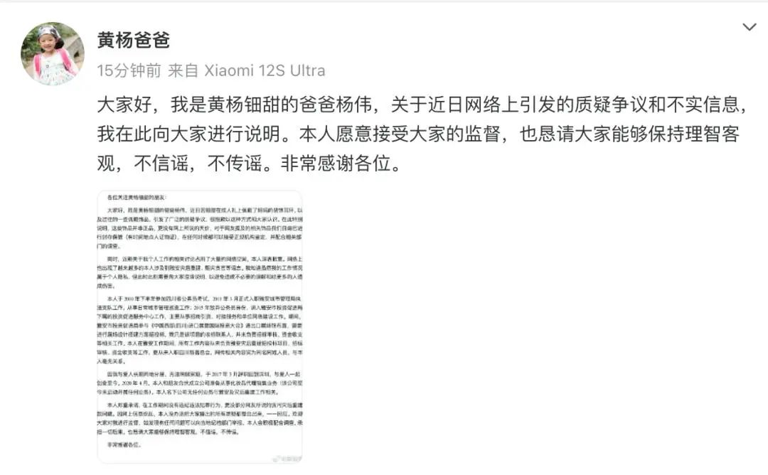 5月16日晚,一位自稱為黃楊鈿甜爸爸的用户在社交平台發文,文章稱女兒佩戴的耳環是假貨,不值那麼多錢。並稱自己早就辭去公務員職位,在任職期間並不負責招標審核和資金相關的工作。