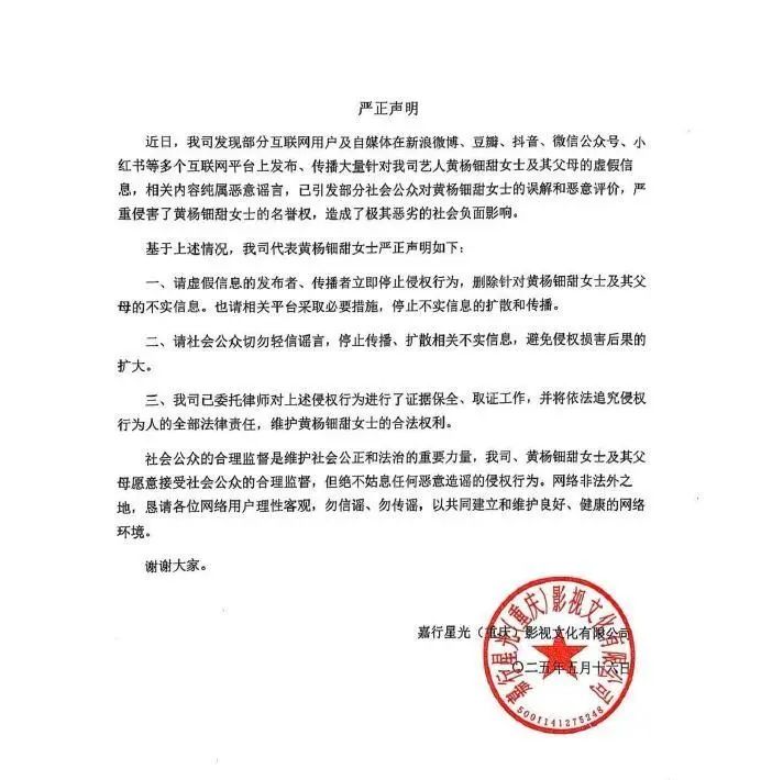 5月16日,黃楊鈿甜的經紀公司@嘉行傳媒 官方微博發表聲明,稱部分互聯網用户及自媒體在新浪微博、豆瓣、抖音、微信公眾號、小紅書等多個互聯網平台上發佈、傳播大量針對我司藝人黃楊鈿甜女士及其父母的虛假信息,相關內容純屬惡意謠言,已引發部分社會公眾對黃楊鈿甜女士的誤解和惡意評價,嚴重侵害了黃楊鈿甜女士的名譽權,造成了極其惡劣的社會負面影響。