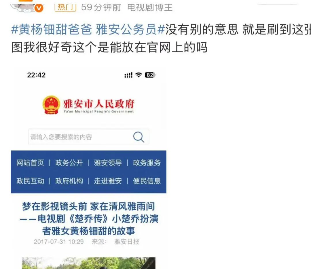 網友還扒出,四川雅安市人民政府的官網上曾經報道過黃楊鈿甜出演《楚喬傳》的事蹟。為什麼政府網站上會堂而皇之出現娛樂新聞?實在讓人費解。