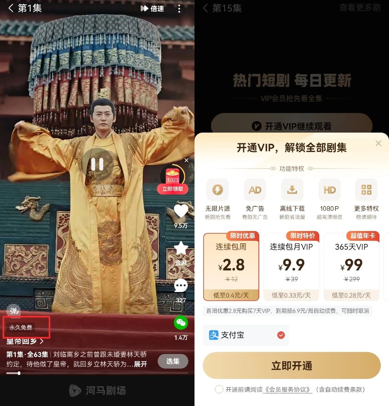 在商業模式上,河馬劇場採用了“免費+廣告+會員”的混合變現策略,這與紅果幾乎主打免費+廣告的運營模式形成了差異化。河馬劇場實行廣告解鎖與會員訂閲雙軌制,部分短劇完全免費,部分則需要購買99元/年的會員卡解鎖。