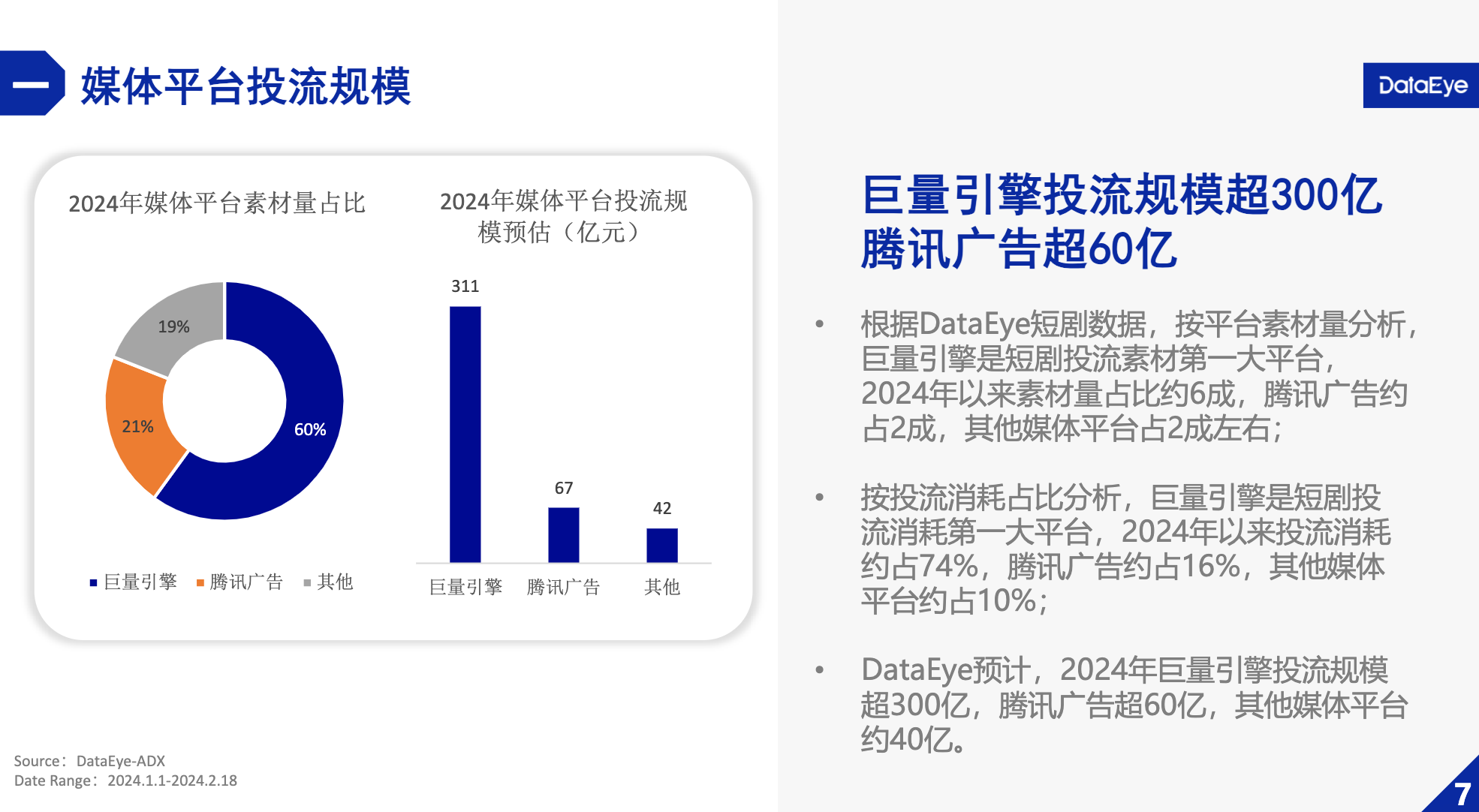 紅果短劇作為字節跳動旗下產品,不僅可以直接藉助抖音、今日頭條等平台的流量支持,實現內部低成本導流,更關鍵的是,據DataEye統計,2024年上半年,巨量引擎成為短劇投放消耗第一大平台,佔比高達74%。