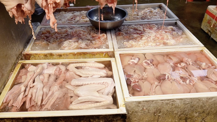 而分門別類摘出來的各種內臟,乾淨、透亮、新鮮,在其貌不揚的菜市場,分割出了三甲醫院手術間的精準和乾淨。