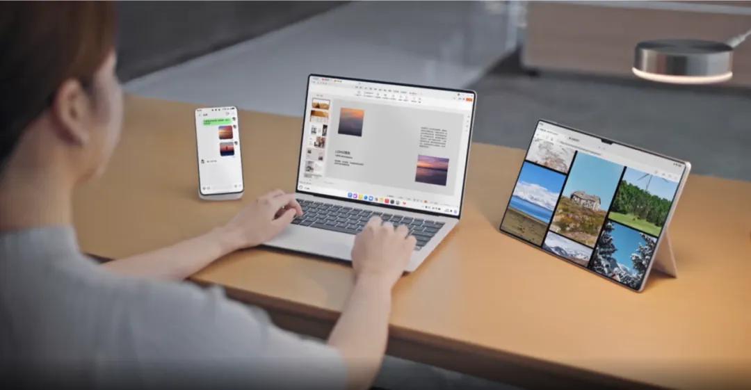 就拿全場景融合生態來説,華為之前致力於構建智慧辦公,基於全場景互聯解決方案去提高辦公效率和協同體驗。如今智慧辦公全面升級為鴻蒙辦公,移動端和桌面端進一步有機融合,用户既能享受移動端豐富的應用、內容,同時大屏的沉浸優勢,鍵鼠的高效率優勢也能有效發揮。