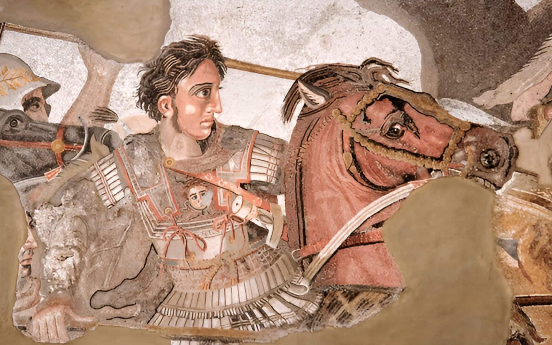 很認真地説一句,沒人能夠肯定亞歷山大大帝真的是上面的模樣。。。説到這裏,我發現差點忘了著名的、來自龐貝古城的Alexander Mosaic(鑲嵌壁畫),這上面酷似朱重八的鞋拔子臉,據説就是亞歷山大大帝的尊榮。同樣的,這副鑲嵌畫本身無題記或人名標註,也不是現代的“戰場攝影”作品。。。大家都覺得應該是,那就是吧。反正鞋拔子臉“年輕而無須、目光鋭利”也是證據(説明這是“英雄”的亞歷山大),我沒開玩笑。
