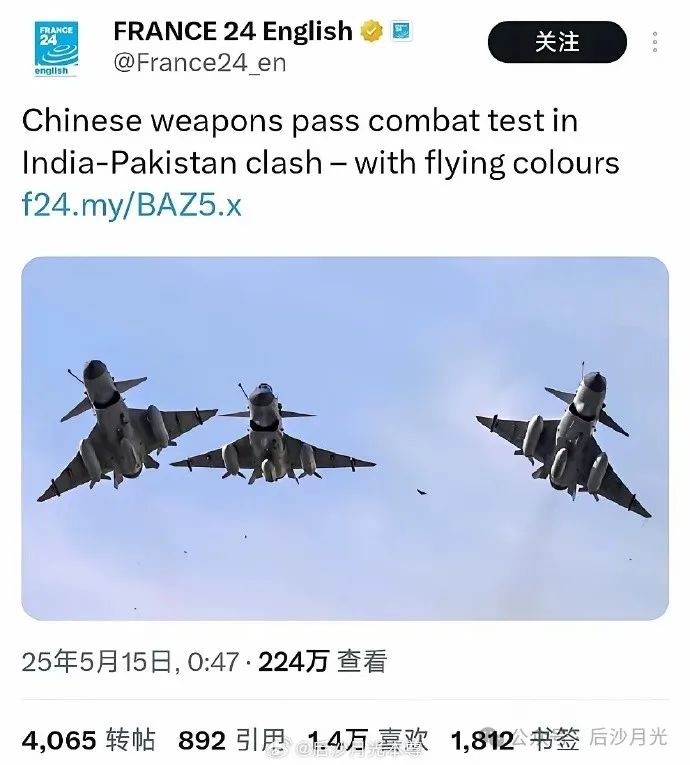 5月15日,法國24新聞台發文,標題是《中國武器在印巴衝突中出色,通過實戰考驗》,一下子就200多萬閲讀量。