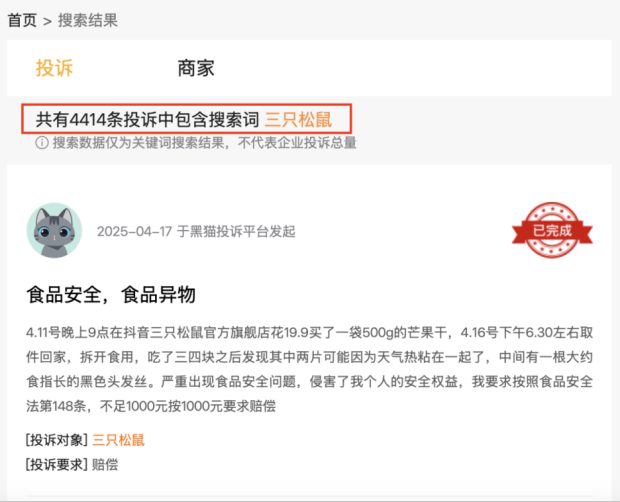 截至目前,在黑貓投訴平台上搜索三隻松鼠關鍵詞,共有4414條投訴(搜索數據僅為關鍵詞搜索結果,不代表企業投訴總量),而關於該品牌的累計投訴總量則是高達2566件,其中包括食品發黴、異物、安全標準超標等問題,這些負面事件不僅嚴重影響了消費者對品牌的信任,也對公司的品牌形象造成了極大的損害。