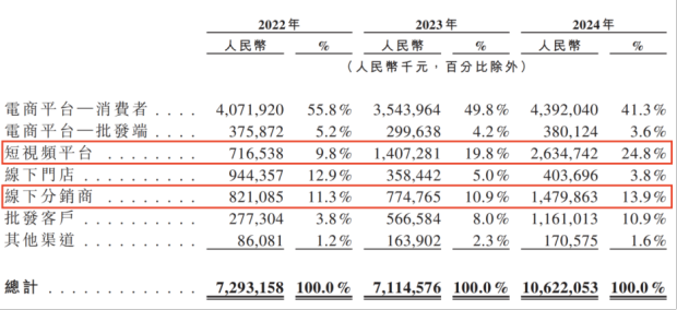進入到2024年,三隻松鼠在抖音上所取得的收入進一步提升,達到了21.88億元,同比增長81.73%,首次超過天貓系的19.37億元,成為最大線上渠道。從招股書中也可以看出,2022年-2024年,三隻松鼠短視頻平台銷售收入分別約為7.17億元、14.07億元、26.35億元;對應占公司營業收入比重分別為9.8%、19.8%、24.8%,佔比接連增長。