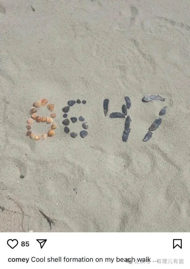 當地時間5月15日,前FBI局長科米在Instagram上分享了一張貝殼被擺成“8647”數字組合的照片,並配文稱這是散步時偶遇的“酷炫貝殼造型”。