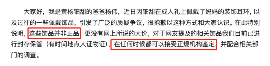 對於這些質疑,黃楊鈿甜的經紀公司嘉行傳媒,發佈了闢謠公告,並對造謠者,予以法律警告。黃楊鈿甜的父親本人,也發佈了一份特別的聲明。在這個聲明中,楊偉重點回答了四個問題: