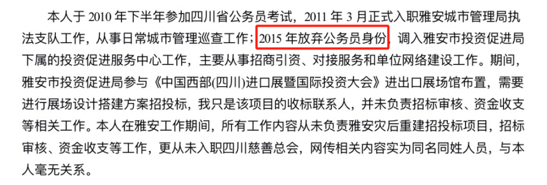 四是,他從未入職過四川慈善總會,這個也是實話。