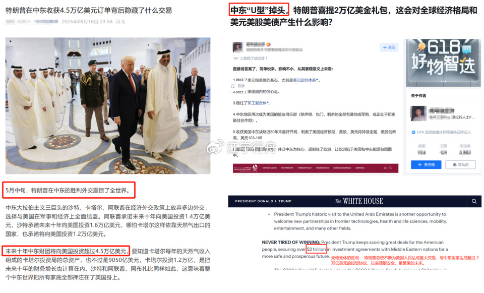 最熱情似火的,都主動替中東國家增加對美投資金額,連天天贏麻了的美國白宮官網都只敢認領2萬億(見右下),到某些自媒體這裏飆升到4.5萬億,翻了一倍都不止。