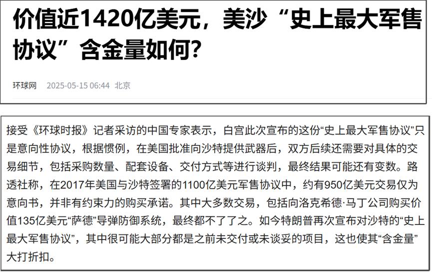 現在一看沙特跟美國籤1420億美元軍售協議,就大呼“沙特反水”。