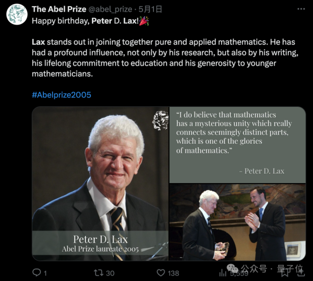 值得一提的是,今年5月1日拉克斯剛剛過完他99歲的生日,阿貝爾獎官方親自發文祝賀,並給予了這樣的評價: