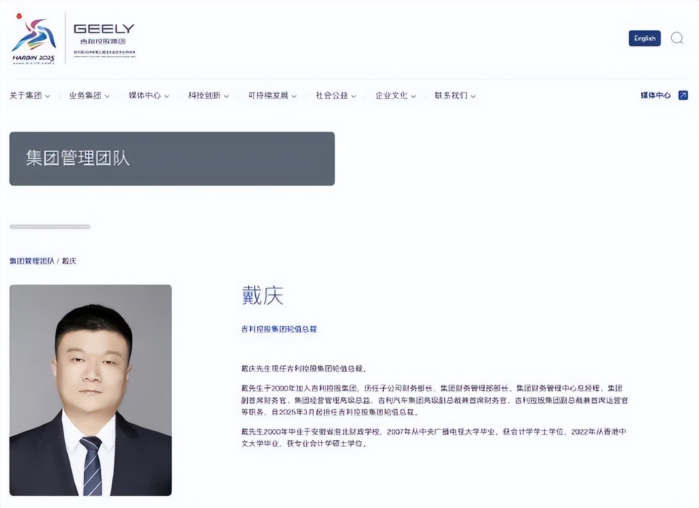 “80後”高管、原吉利控股集團高級副總裁兼首席運營官戴慶已於今年3月29日被任命為吉利控股集團首位輪值總裁,向吉利控股集團CEO安聰慧彙報工作。