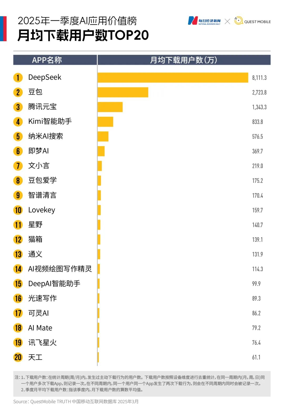 根據每日經濟新聞與QuestMobile聯合發佈的2025年一季度AI應用榜,“天工”的下載量快要跌出行業前20了。