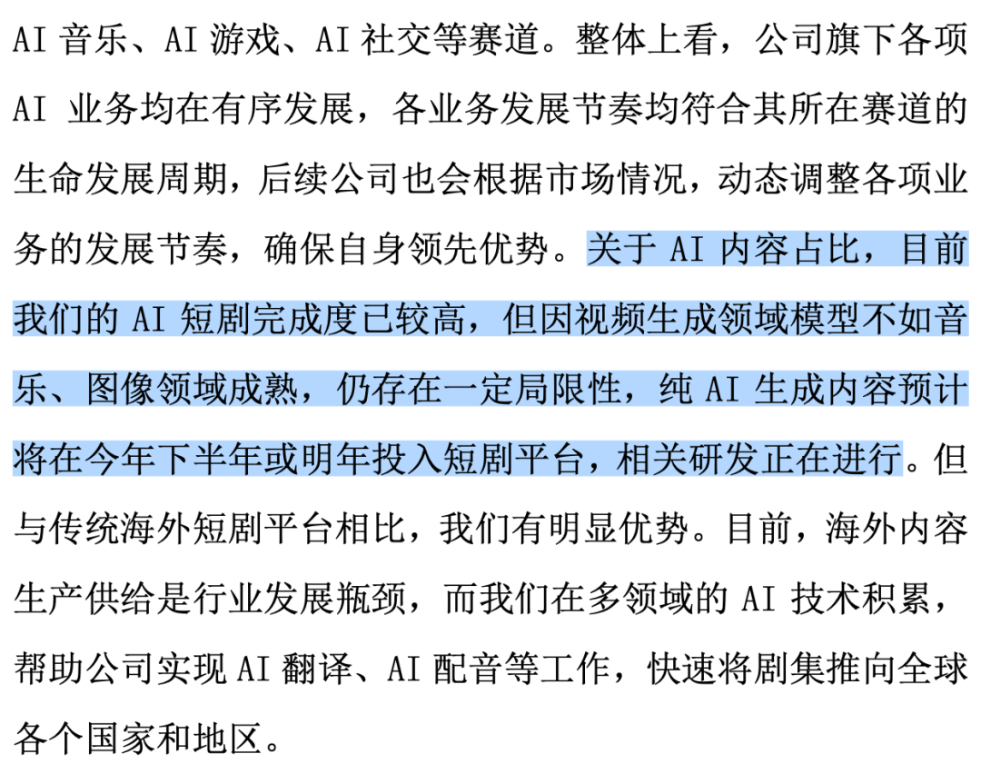 真正的AI短劇內容創作平台是SkyReels。根據公司5月份在投關活動中的表述,真正純AI生成的內容,因為不夠成熟,甚至都還沒有上線。