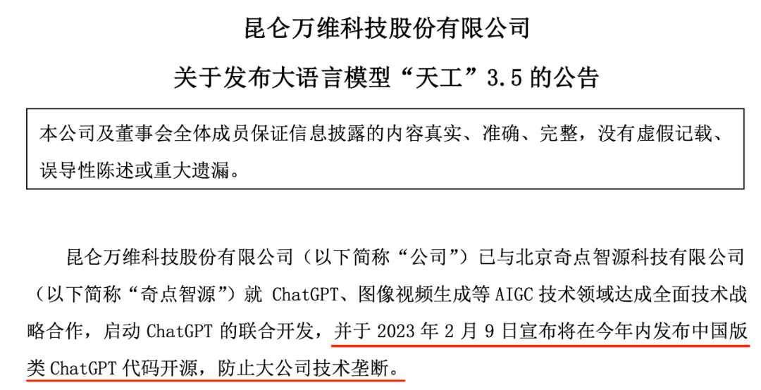 在大多數人還在看ChatGPT熱鬧的時候,崑崙萬維打着“防止大公司技術壟斷”的旗號,宣佈啓動ChatGPT聯合開發,發佈“天工”大模型。