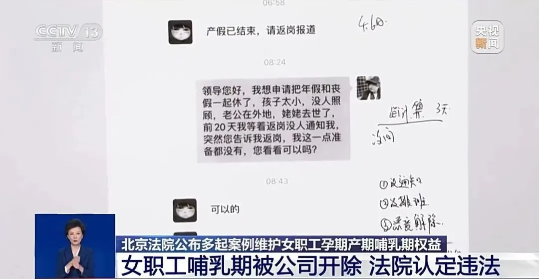 張女士就職於北京一家公司,生完孩子產假結束後,公司人事微信通知她返崗,張女士回覆:“領導您好,我想申請把年假和喪假一起休了,孩子太小了,沒人照顧,老公在外地,姥姥去世了……您看看可以嗎?”