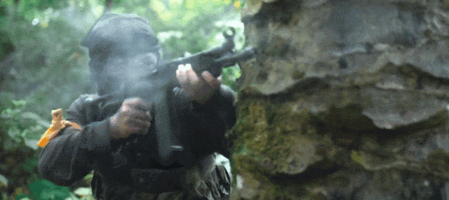 第一場要説的就是雙方的叢林遭遇戰。單從演員的戰術動作和真槍拍攝的視聽感受來説,這段戲可以説還是很不錯的,但是,導演為了藝術效果,在戰鬥決策的科學上性上,做得並不到位。