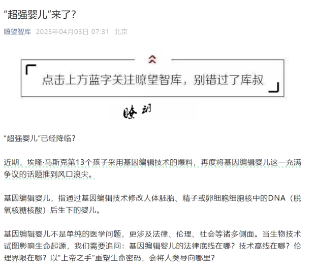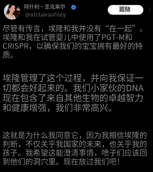 最近關於基因編輯的傳聞還有幾個。前些日子馬斯克又多了一個孩子,然後推特上有傳聞説上一個孩子(第十三個)是進行過基因編輯的;openai的山姆奧特曼最近也得到了他的孩子。他是同性戀者,這個孩子是代孕產物,也有傳聞説這個孩子出生前進行了基因編輯。