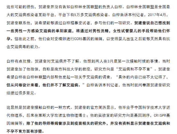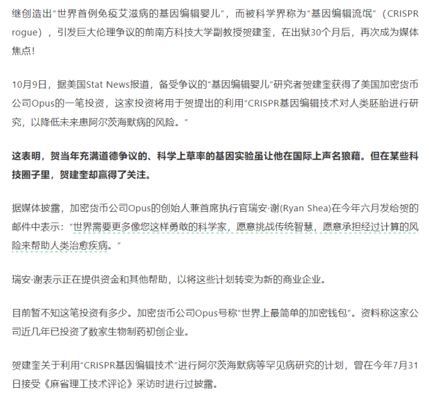 之所以説會遲早發生,是因為之前就有媒體報道,在他出獄之後就有海外富豪資助他研究阿茲海默症,出獄後在國內他依然繞開了法律的部分限制,主導了部分研究。更早還有傳聞,基因編輯嬰兒事件本身就有海外利益方參與。這也很符合他的背景,所以在中國身敗名裂的他,選擇去海外進行他的瘋狂實驗,一點都不奇怪。