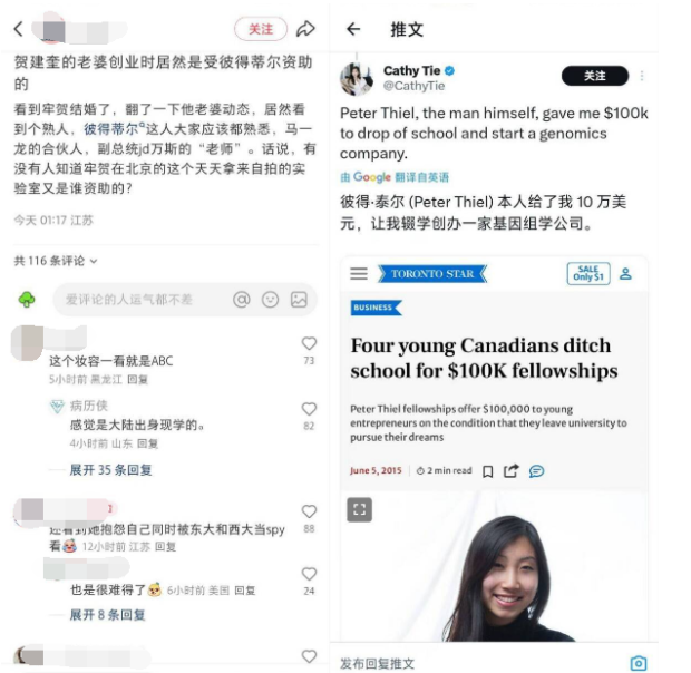 而最近賀建奎的新妻子,英文名字叫cathy tie,是個移民了加拿大的華人,她因為曾經接受過彼得蒂爾的資助開辦一家基因組學公司而引起網友的關注與聯想。不過筆者倒是覺得沒什麼必要,這位女士創建的基因組學公司已經處於某種查無此人的狀態,並沒有做出什麼成果,連新聞都沒有幾條。筆者覺得她的情況更類似創業熱潮裏捧出來的某些創業明星,一切都是為了炒作,孫宇晨孫割的女友,當年不也是創業明星嗎?cathy tie女士可能和彼得蒂爾並沒有什麼私交,但是她和賀建奎搞在一起,對於歐美的創業圈子無疑是極有吸引力的。