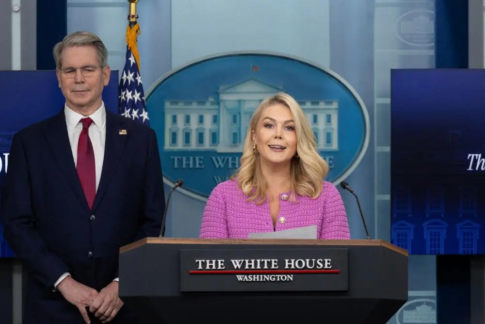 ▲4月29日,美國白宮新聞秘書萊維特(右)與財政部長貝森特在白宮出席記者會。萊維特批評報道中有關亞馬遜計劃就商品售價標註加徵關税成本的做法是“敵對且政治化的行為”。(圖片來源:新華社)