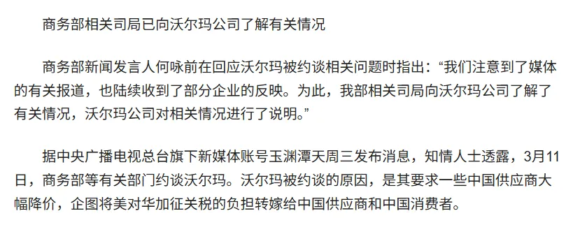 ▲3月13日,商務部舉行例行新聞發佈會。新聞發言人何詠前回應了包括約談沃爾瑪等問題。中國商務部於3月11日就沃爾瑪向中國商户壓價的問題約談了這家美國超級零售商。在5月初中國商務部宣佈考慮與美國談判之後,沃爾瑪被曝出已經向中國江浙等地的商户發出增加發貨量請求,那些商户表示“沃爾瑪已告知我們開始增加對美國的發貨量,這樣我們就不需要承擔對中國商品徵收新關税帶來的額外成本”。12號中美發表聯合聲明後,進一步傳出的消息稱,中國多地廠商收到大量訂單,美國採購商出現報復性大規模進貨。