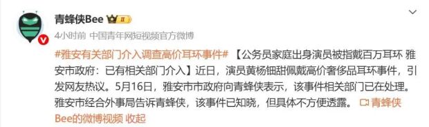 演員黃楊鈿甜戴疑似天價耳環炫富的事情持續發酵,她曾經任公務員父親的廉潔問題是主要質疑點。目前她父親本人的説法和其之前所在機構的説明都不被網友買賬,雅安紀委回應記者詢問時表示,“相關政府部門正在處理此事”。