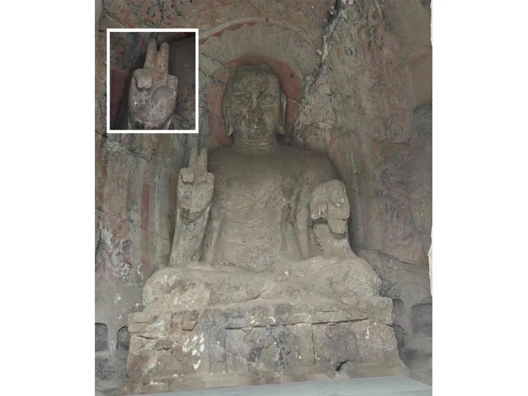 此行中,我們在龍門石窟的賓陽北洞看到了唐高宗初年雕刻的一尊佛像,其右手向前伸出三根手指,由於大拇指被破壞,斷掉了一截,食指和中指間又有些距離,看起來很像“剪刀手”。正是這尊佛像萌翻了眾多網友,成為熱門話題。
