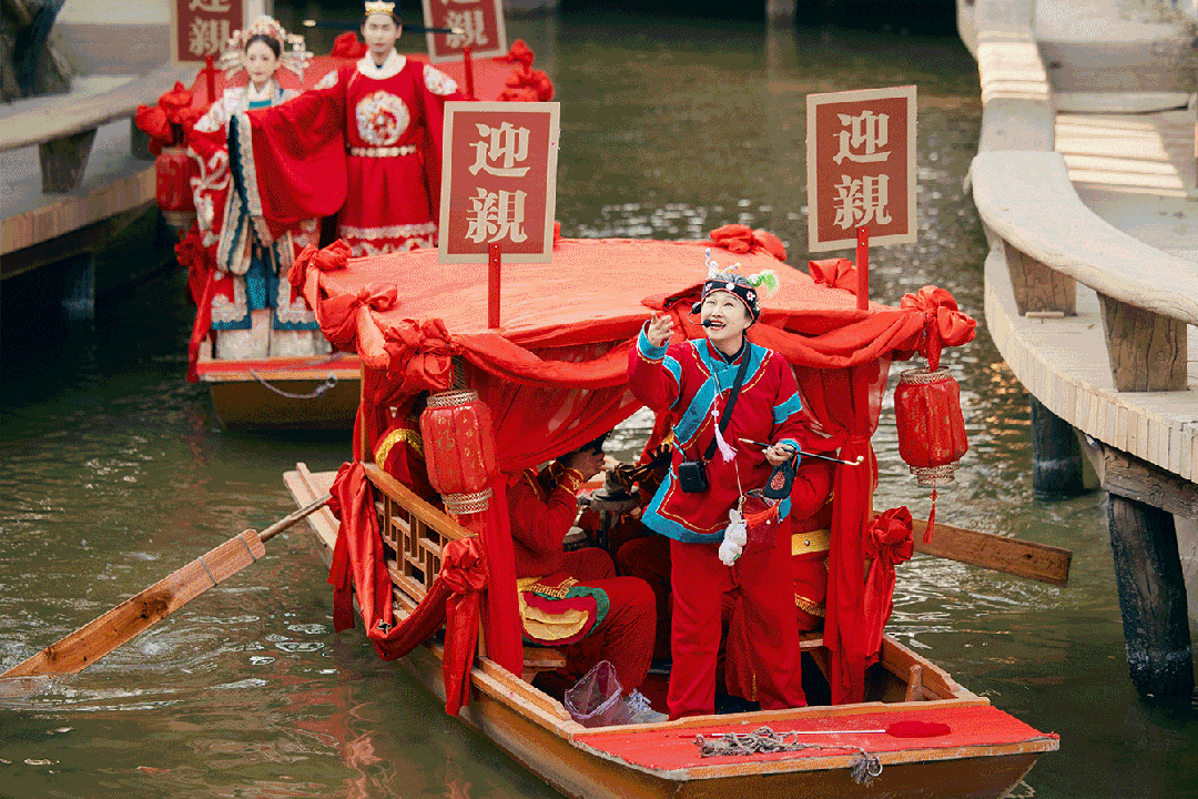 演員和遊客強互動,是萬歲山一大特色。王婆火,火就火在把土味情話融入“拋繡球招親”的場景,和參與者激情碰撞。這次我們見到了正當紅的呂婆。去年11月,這位40多歲的素人蔘加“王婆説媒”演員選拔,雖未入選,卻憑着幽默感被導演組發掘,簽約成了景區的NPC。她將傳統秧歌與現代街舞元素融合,與遊客即興鬥舞,今年3月單條視頻漲粉過百萬。