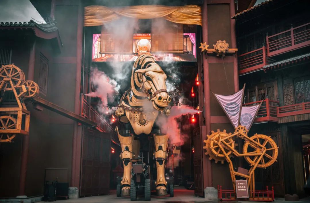 在清明上河園,我感到文旅不僅是服務業。文旅設備的研製是先進製造業,景區的電子票務和支付是數字科技。前幾年清明上河園和大連一家企業合作研製了大型高科技巡遊表演機器馬“中華巨馬”,把唐三彩馬、諸葛亮的“木牛流馬”與高科技元素、蒸汽朋克的工業元素融合,以機械結構為核心,用98個運動關節靈活還原了馬的體態和神韻。