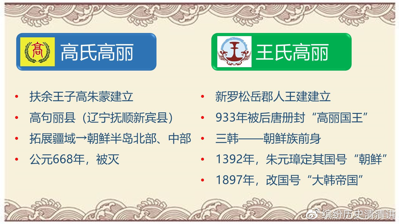 3.朝鮮半島的政權變化。668年,高句麗被唐朝與新羅聯軍所滅。新羅(676—935年):新羅在唐朝支持下統一半島大部,但未完全繼承高句麗領土。高麗王朝(918—1392年):由王建建立,國號“高麗”取自“高山麗水(完全的漢語字義)”,與高句麗(音譯)名稱相似但無直接繼承關係。李氏朝鮮(1392—1910年):取代高麗,成為朝鮮半島最後一個封建王朝。